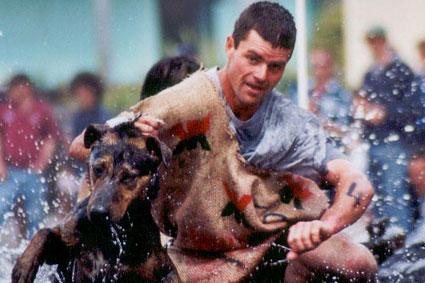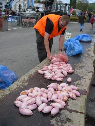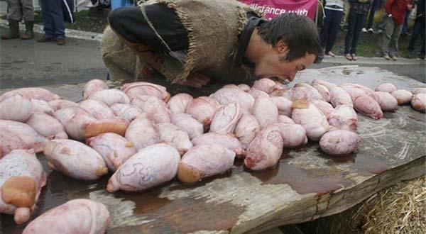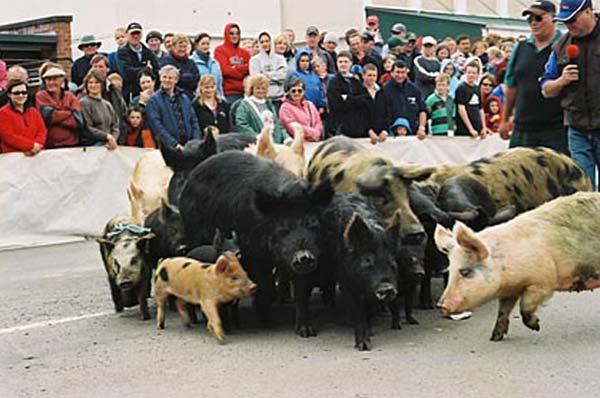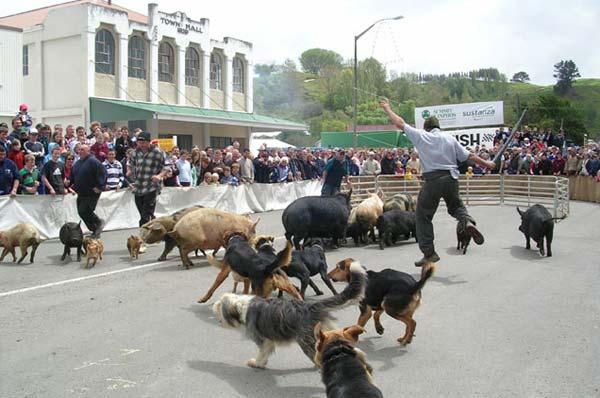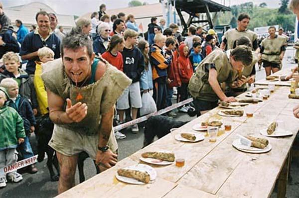 Как говорят сейчас в "инторнетах" - тамада хороший и конкурсы интересные. А с другой стороны традиция есть традиция. Что-то мы у них не понимаем, что-то они у нас не "догоняют". В Новой Зеландии проходит традиционный забег Hunterville Huntaway Festival с бычьими яйцами в зубах. Участнику нужно пронести в зубах яйцо на расстояние порядка 50-ти метров, перевезти собаку в тачке, съесть бычий пенис, окунуться в таз с водой. В общем скучать не придется и накал борьбы обеспечен.