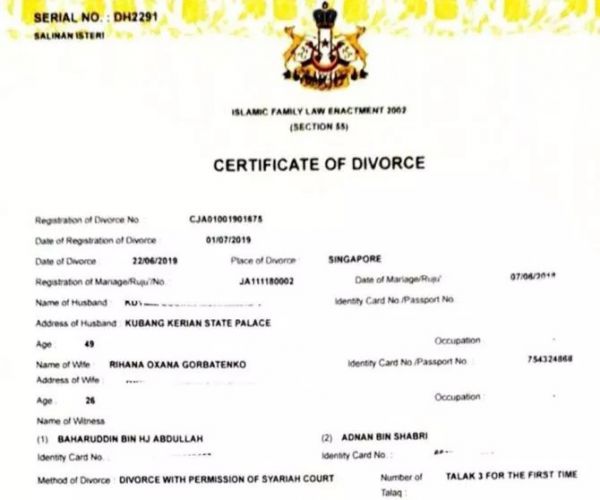 Официальный развод был зарегистрирован 1 июля 2019 года. Документ засвидетельствован гербом султаната Келантан и помечен как копия для супруги. Расторжение брака произошло вследствие троекратного произношения слова «талак», что считается самой строгой и бесповоротной формой развода в исламе. Процедура была зарегистрирована в Сингапуре.