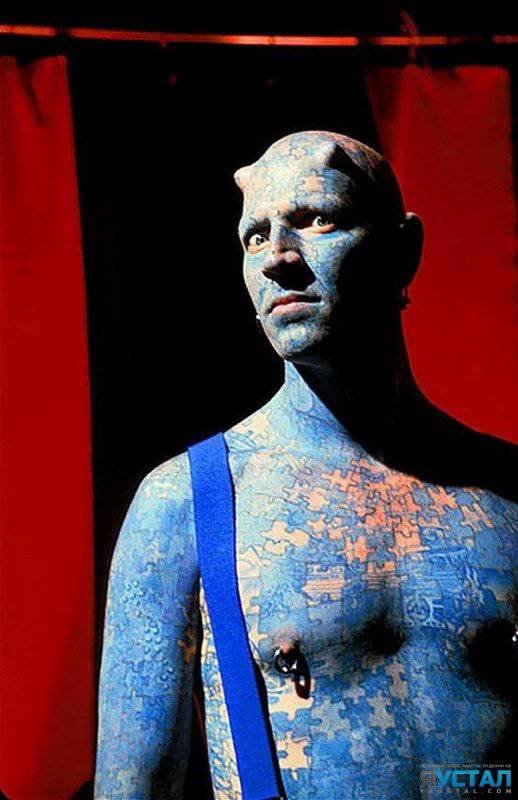 Неизвестно, является ли Пол Лоуренс любителем паззлов, но если вы бросите на него хотя бы один взгляд, то решите, что он сходит по ним с ума: тело шпагоглотателя, для которого вполне нормально просверлить электродрелью собственную ноздрю, покрыто синими головоломками. Татуировки человека по прозвищу Загадка являются работой более 200 тату-мастеров, а однажды над его татуировками одновременно работали 23 человека.