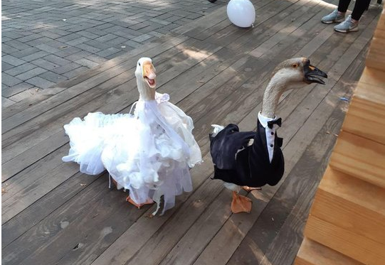 Молодожены, как и положено, были в свадебных нарядах. Харвистера облачили в костюм с бабочкой, а невеста Кришна была в традиционном белом платье. Союз скрепили обручальными кольцами, которые птицам надели на шеи.