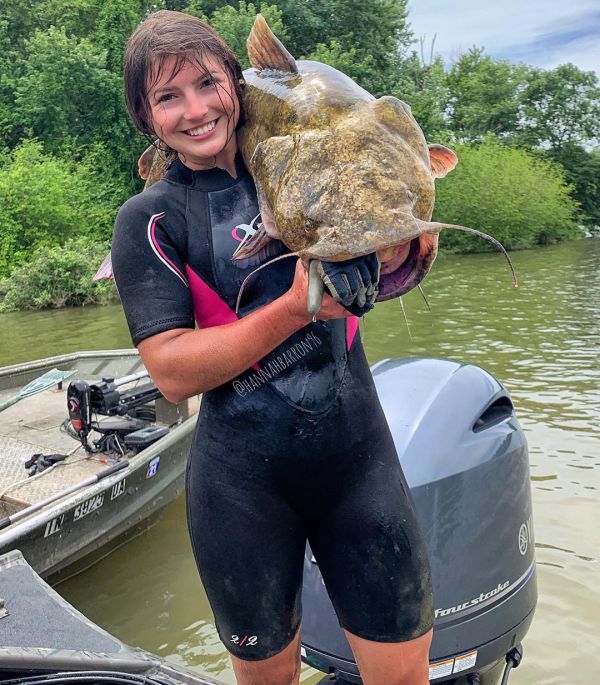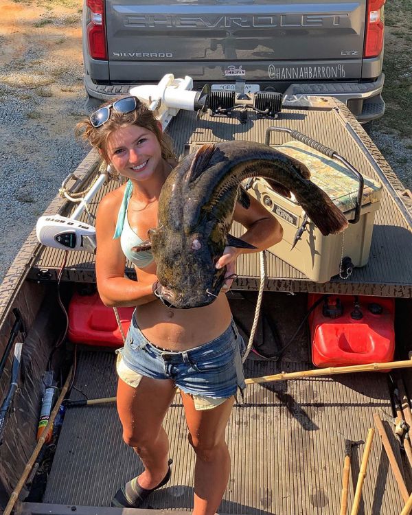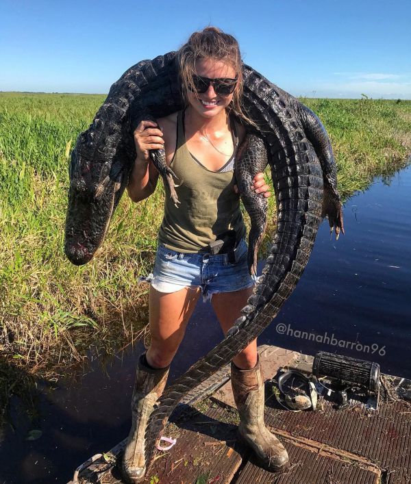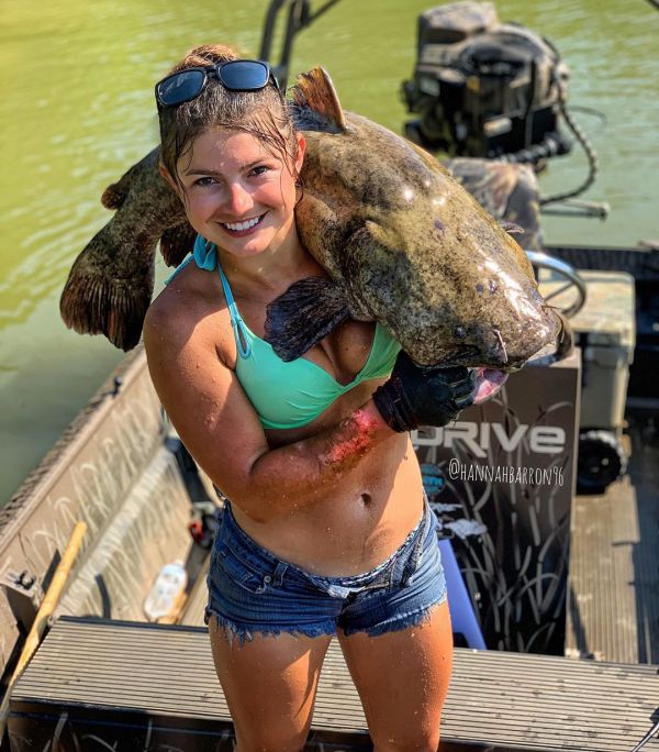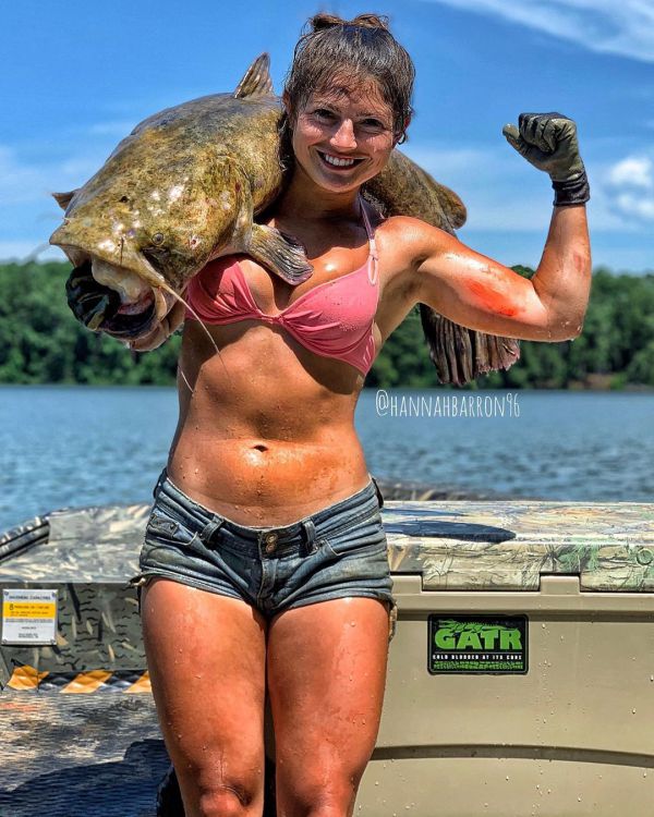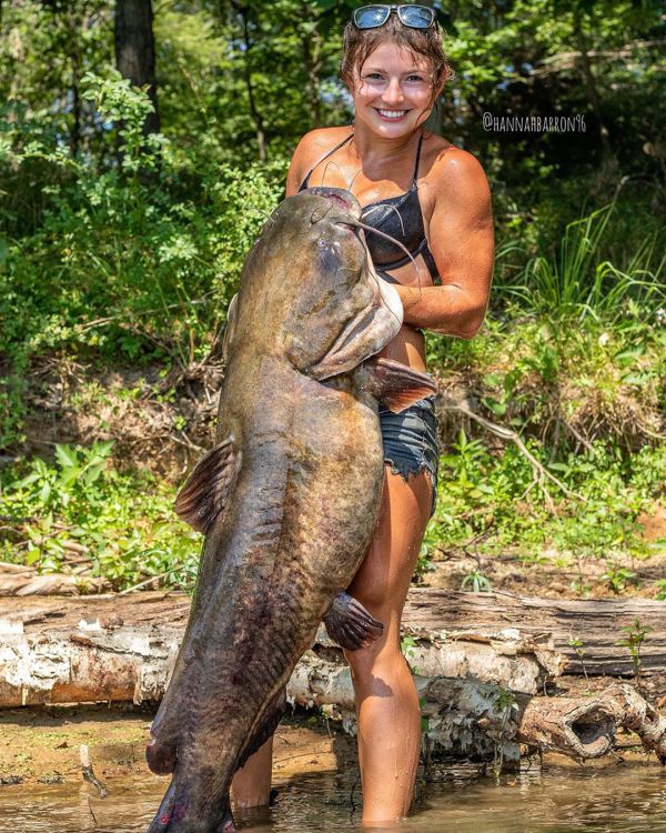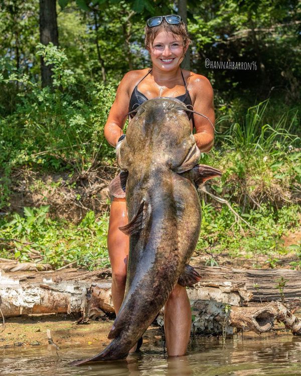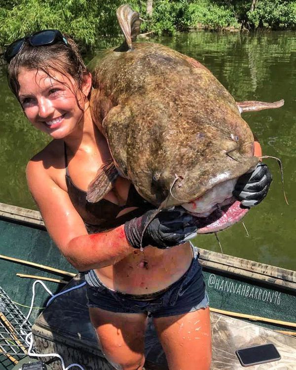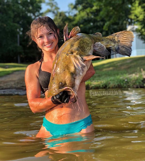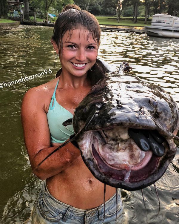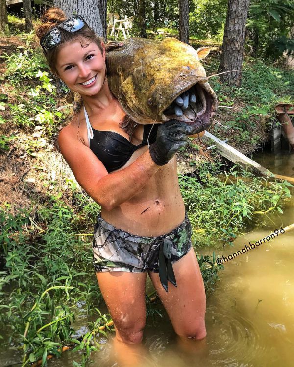 23-летняя американка Ханна Баррон (Hannah Barron) очень любит охоту и рыбалку. Особенно ей нравится ловить сомов голыми руками. Девушка засовывает руку в нору под водой, сом заглатывает ее, а вторую руку она просовывает через жабры и вытаскивает рыбу. У сомов нет зубов, но у них огромная пасть, которая помогает проглотить добычу. После фотографий улова сомов отпускают обратно.