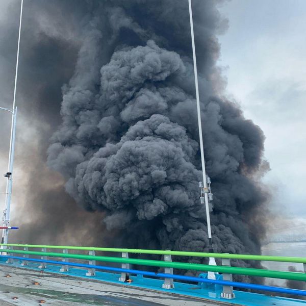 Драматические кадры из порта показывают густой чёрный дым, исходящий от кораблей, пока пожарные пытаются загасить пламя, заливая его обильными потоками воды.