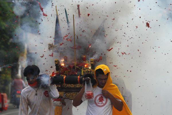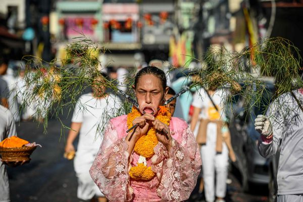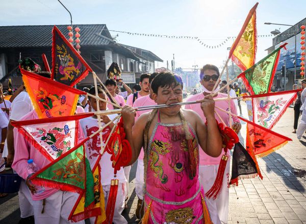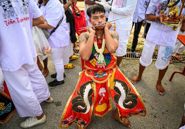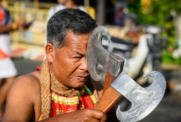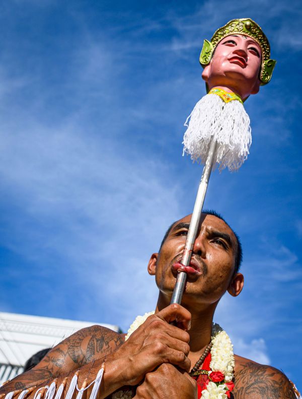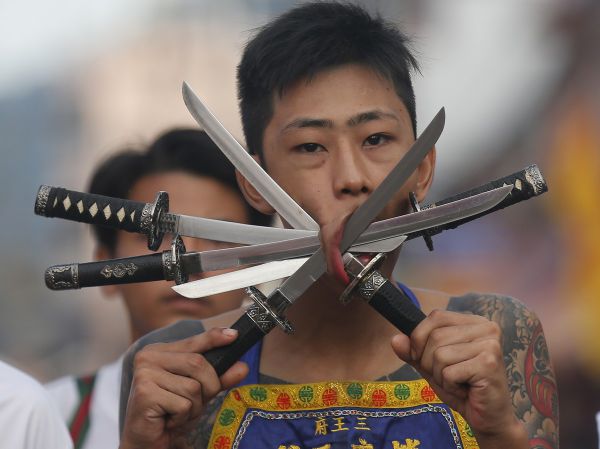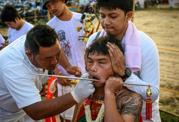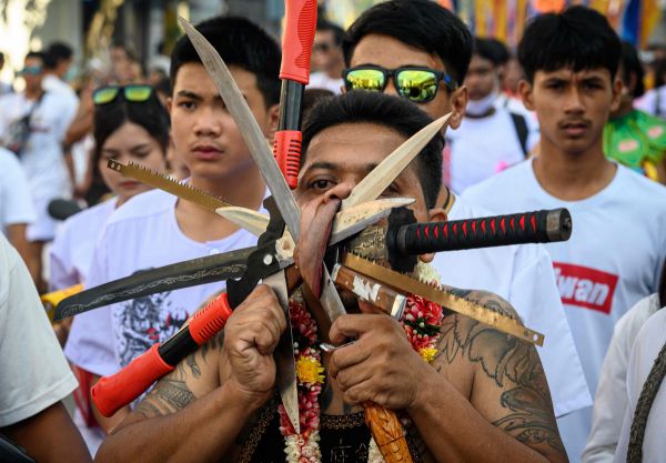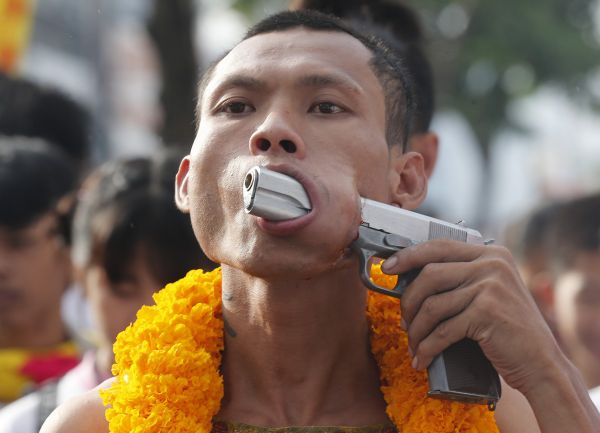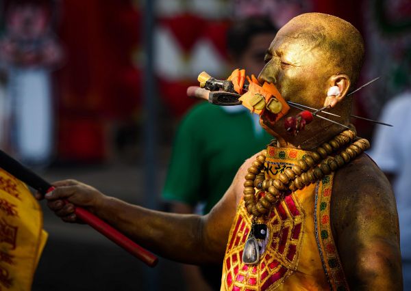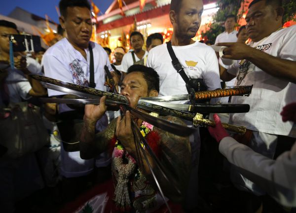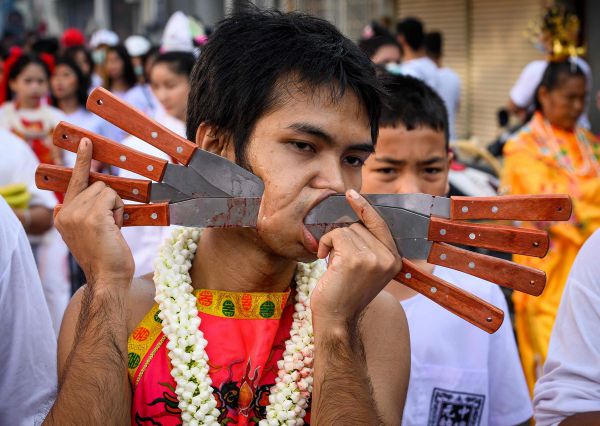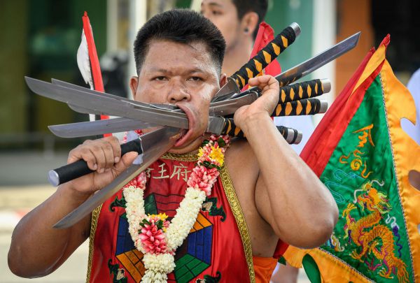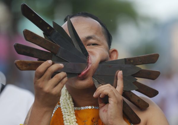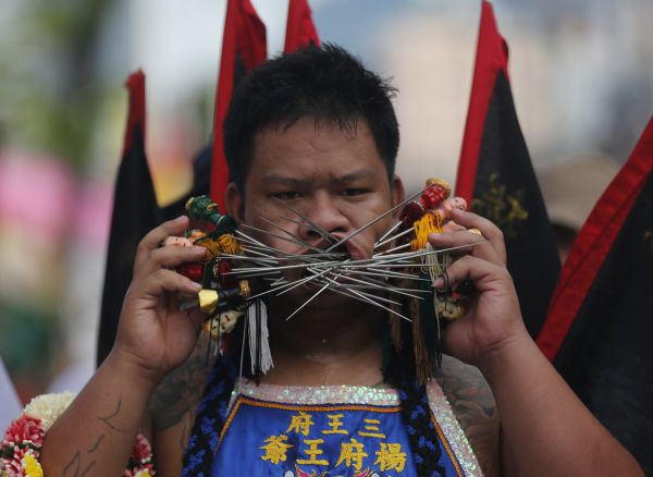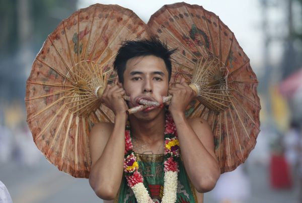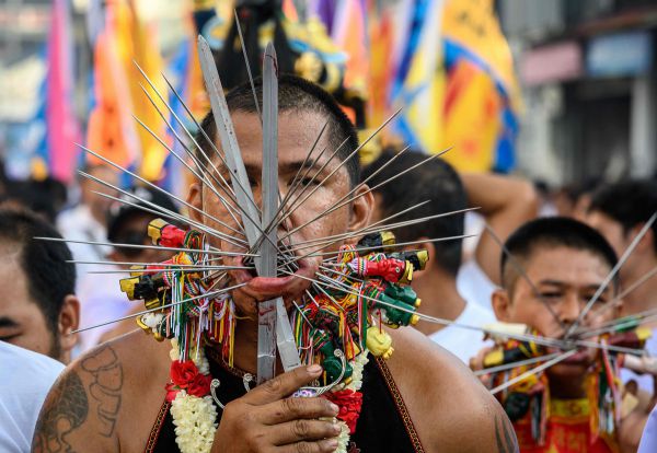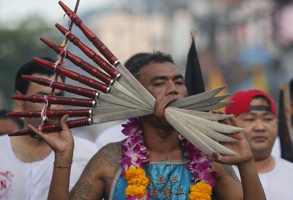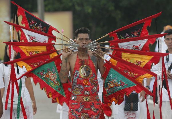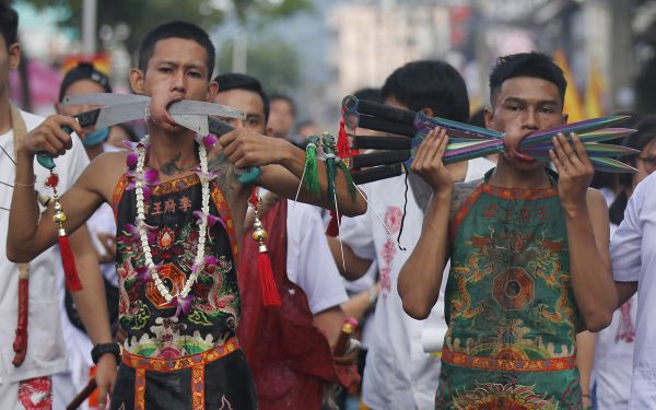 Каждую осень на таиландском острове Пхукет проходит буддистский фестиваль Девяти Богов Императоров. Во время мероприятия сотни людей истязают себя, чтобы показать силу веры. Участники прокалывают язык, губы и щеки различными предметами, такими как: ножи, мачете, мечи, спицы, пистолеты и т.д. Считается, что чем больше предметы или их количество, тем сильнее боги оценят такое жертвоприношение. Праздник проходит каждый год в девятом месяце по лунном календарю. Начинается он в девятый день такого месяца и длится девять дней.