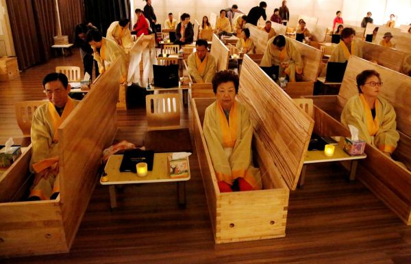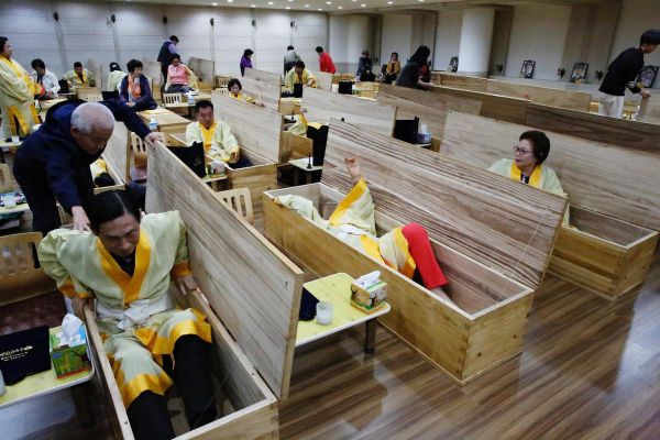 Южнокорейская похоронная компания Hyowon организовывает массовые похороны для живых, чтобы люди почувствовали ценность жизни, задумались о будущем и примирении с родными, осознали свою смертность, а если кратко — улучшили свою жизнь путем симуляции смерти. Дела у компании идут прекрасно: в живые похороны уже поиграли более 25 000 человек.