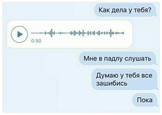 4. Аудиосообщения нужно слушать. А если ты в людном месте или не один? Наушники? Вот значит кто-то не хочет напрячься и написать текст, ему легче проговорить, но он тебя хочет напрячь, чтобы ты достал и одел наушники.