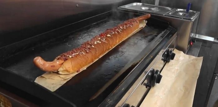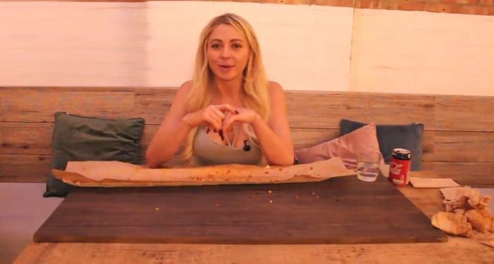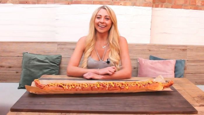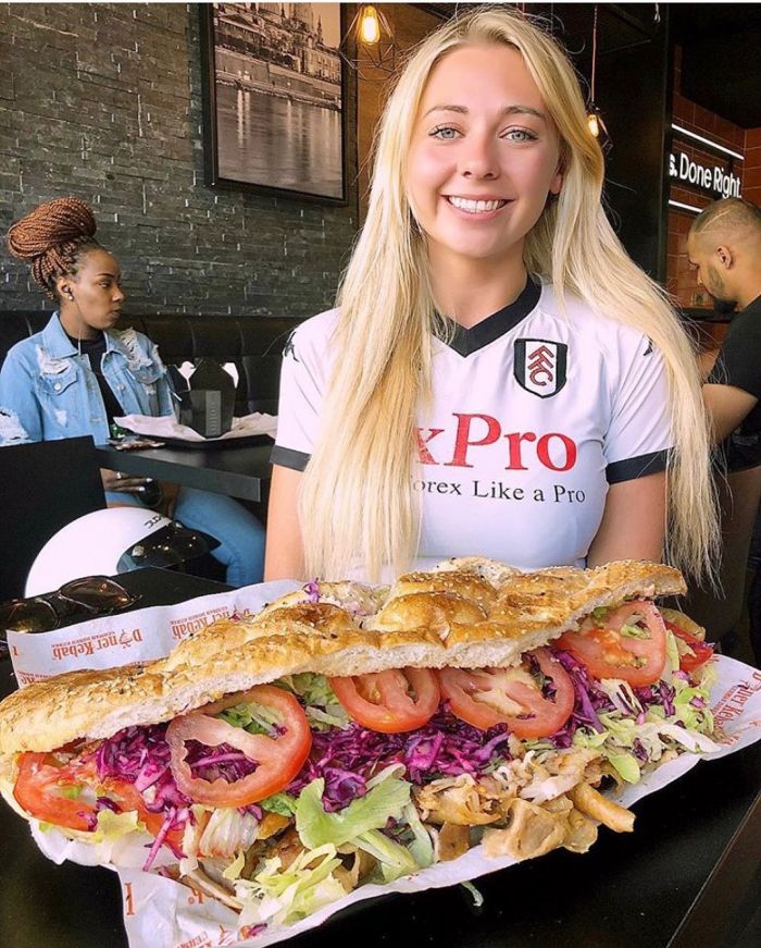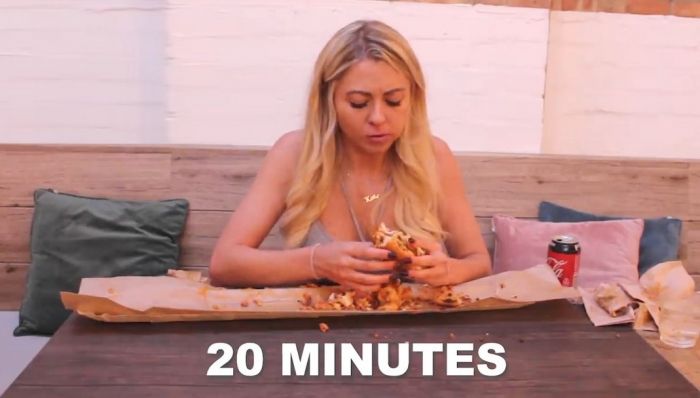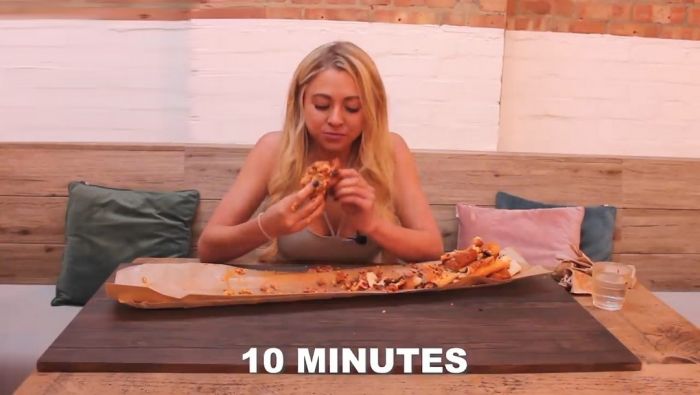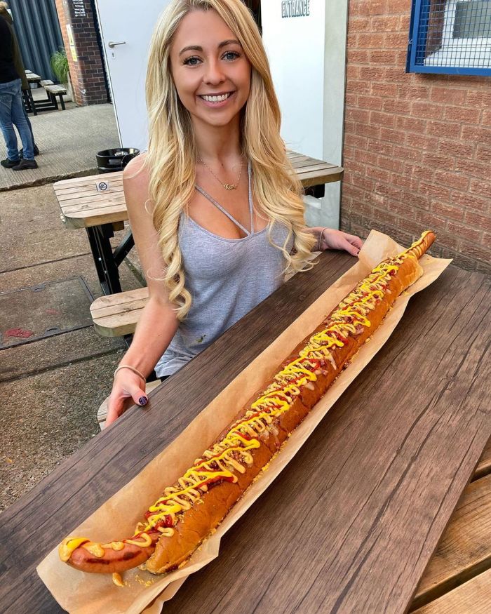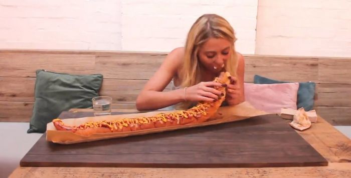 25-летняя Кейт Овенс (Kate Ovens) довольна известна в социальных сетях и ведет канал на YouTube, где на камеру поглощает большие порции различных блюд. На последнем опубликованном видеоролике девушка посетила ресторан Oh My Dog в Four Pure Brewery, Бермондси, юго-восточный Лондон, где съела большущий хот-дог. Миниатюрный фуд-блогер съела огромный метровый хот-дог с 5000 калориями всего за 25 минут.