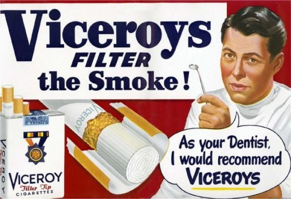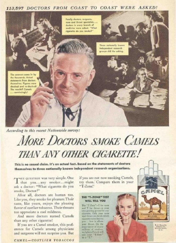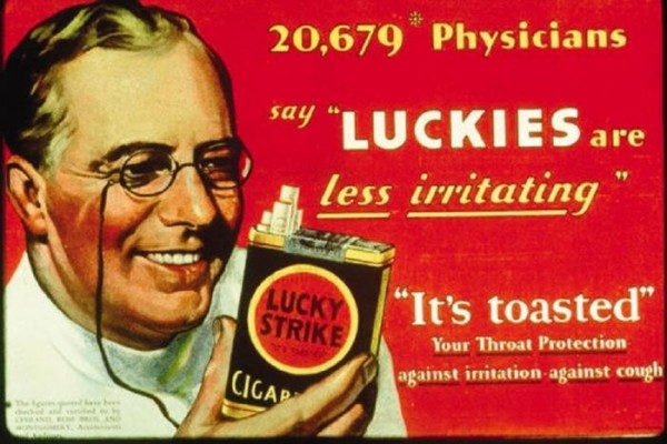 Было время, когда врачи активно продвигали сигареты — или, по крайней мере, показывали — в десятках рекламных объявлений с предположительно авторитетными отзывами врачей. Все началось в начале 1950-х, руководители табачных компаний вовсю эксплуатировали имидж врача, чтобы убедить несчастного курильщика в том, что их бренды безопасны.