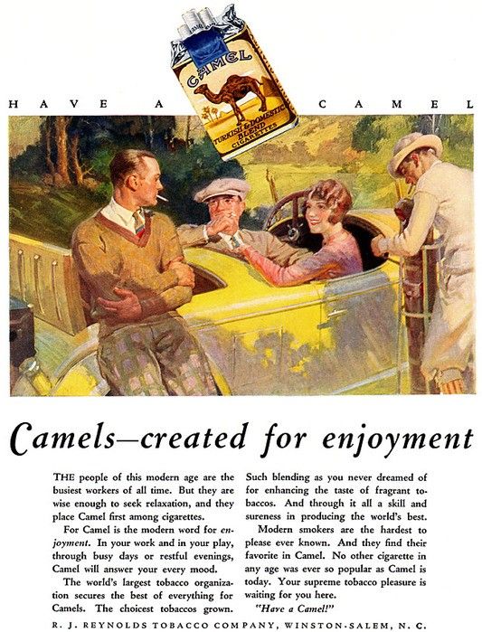 А в 1991 г кончилось — в Америке разразился грандиозный скандал с рекламой сигарет и достиг ужасного апогея. Это случилось, когда Американская медицинская ассоциация обнародовала результаты, согласно которым маленьким детям легче распознать талисмана верблюда Джо Кэмела, чем таких персонажей, как Барби или Микки Маус. Откровение положило конец кампании Джо Кэмел.
