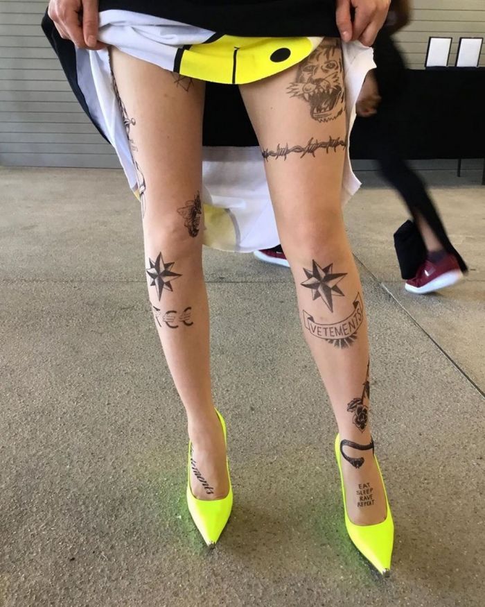 Увидели красивую девушку, у которой все ножки в тюремных татуировках? Не спешите пугаться и убегать! Вполне может быть, что это модница в колготках от бренда Vetements. Дело в том, что это колготки с нарисованными мастями, воровскими татуировками.