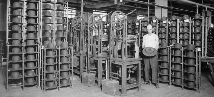 Шляпы на фабрике Джона СтетсонаОбраз ковбоя в шляпе с лихо загнутыми полями, по всей видимости, является изобретением рекламщиков. Мужественные ковбои в модных шляпах проникли на рекламные щиты Мальборо, а оттуда — в голливудское кино.