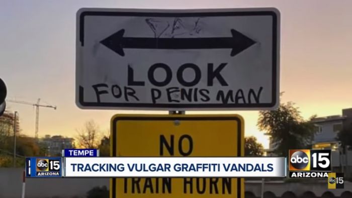 "Человек-пенис" оставляет свой неприличный "тэг" на самых неожиданных предметах. Граффити его авторства можно обнаружить на заброшенных зданиях, светофорах, мусорных контейнерах и даже выброшенных на помойку диванах.В репортаже, показанном на местном телеканале, также демонстрируется испорченный вандалом дорожный знак, который призывает водителей "искать человека-пениса".