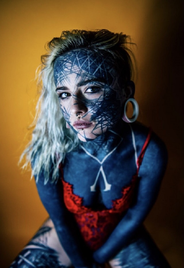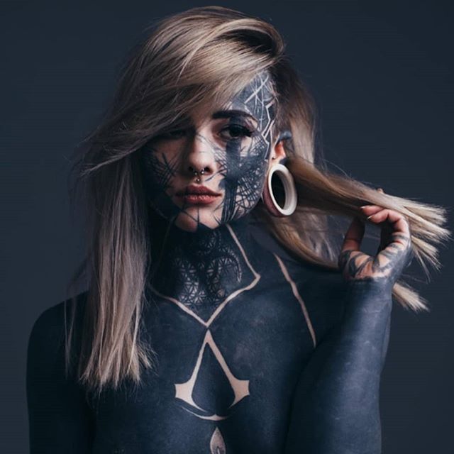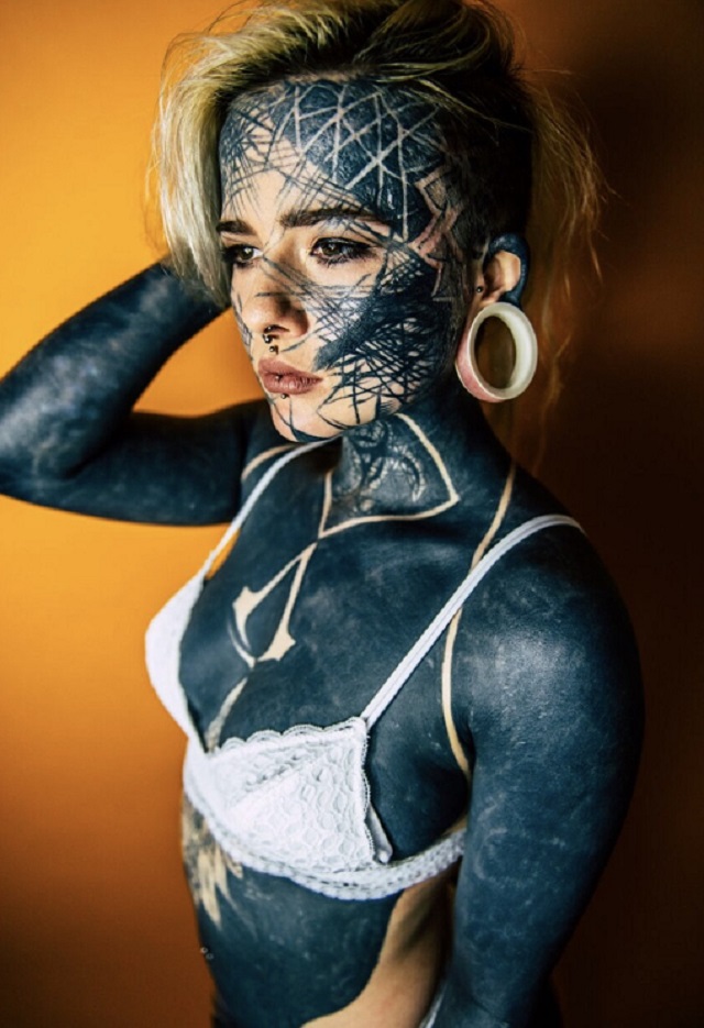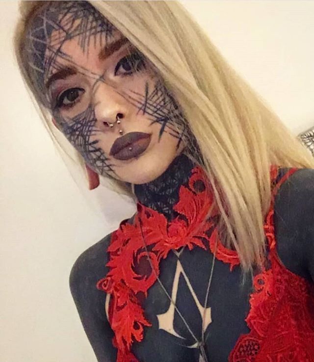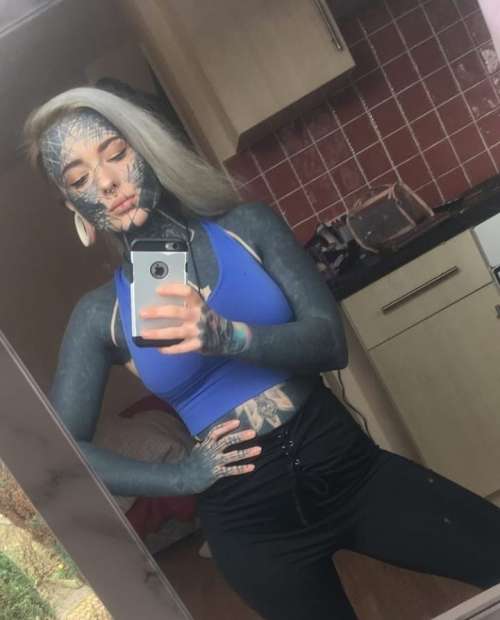 Шотландская барышня по имени Надин Андерсон настолько любит черный цвет, что зататуировала себе почти все тело черной краской. Выглядит это, мягко скажу, необычно. Возникает вопрос - НО ЗАЧЕМ??!! Причем работает Надин социальным работником... Интересно, подопечные от нее не шарахаются?
