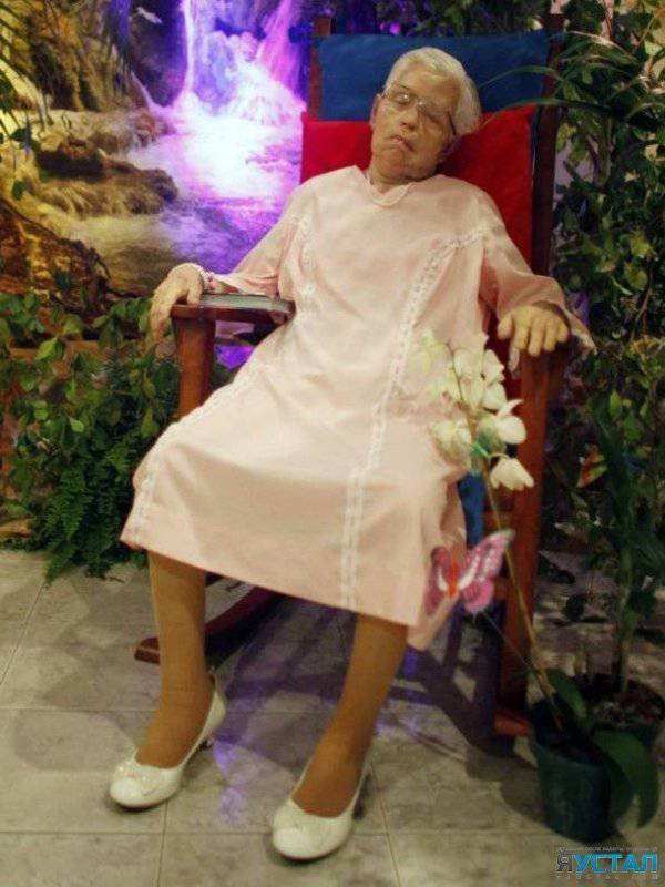 В последнее время набирает популярность тенденция провожать человека в последний путь не в гробу, а в привычной для усопшего обстановке. 80-летняя Джорджина Червоны Ллорен из Пуэрто-Рико встречала своих друзей на собственных похоронах в кресле-качалке одетая в собственное свадебное платье 32-летней давности.