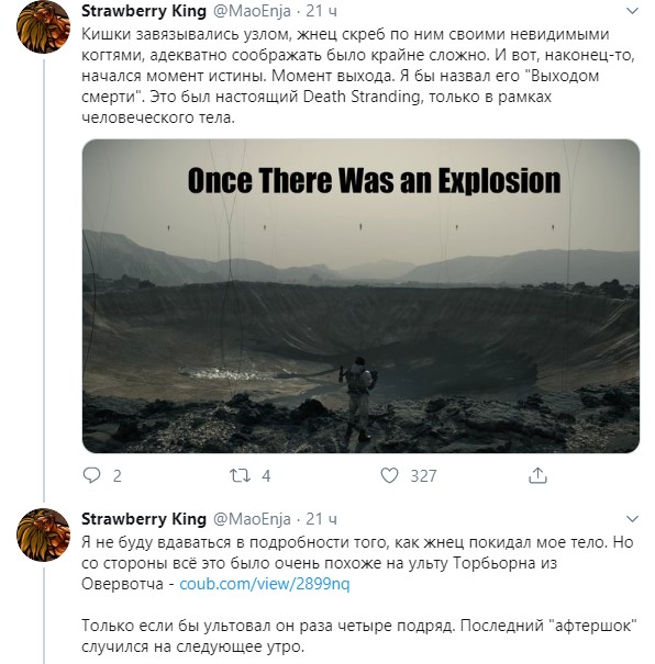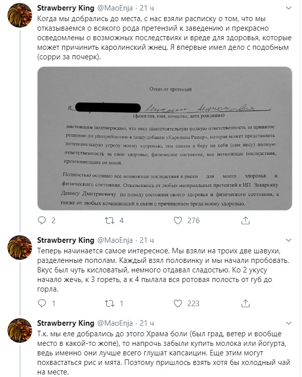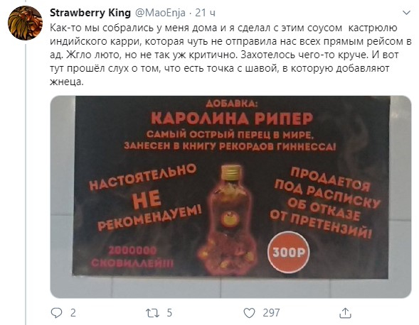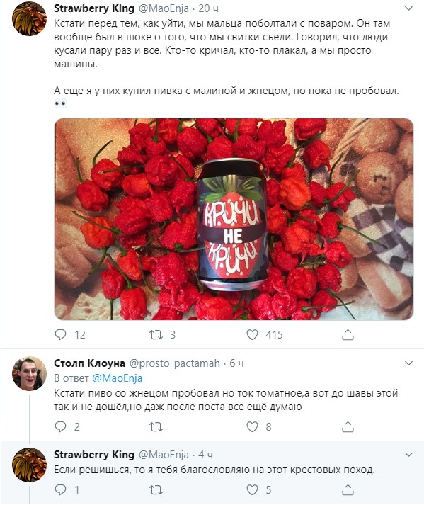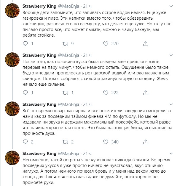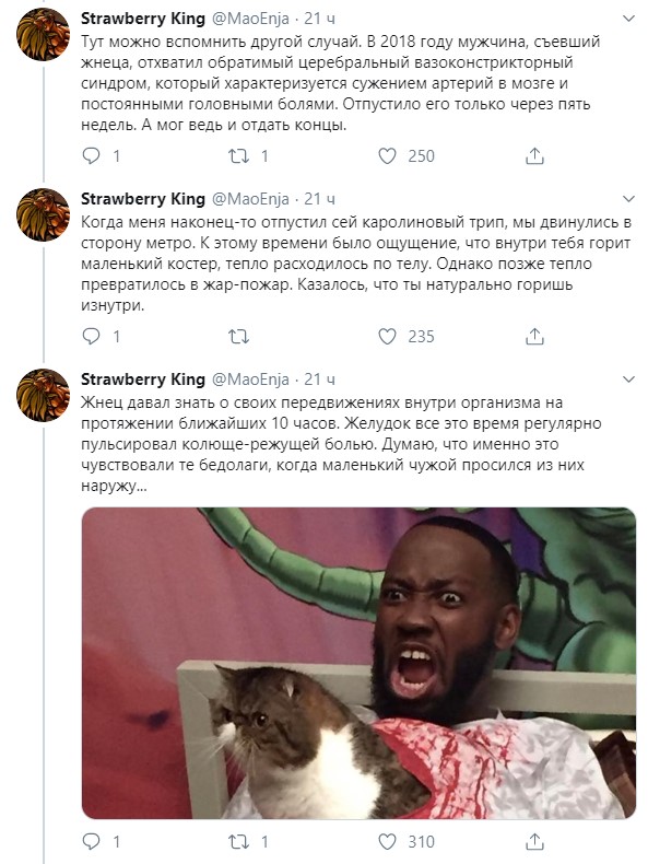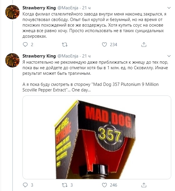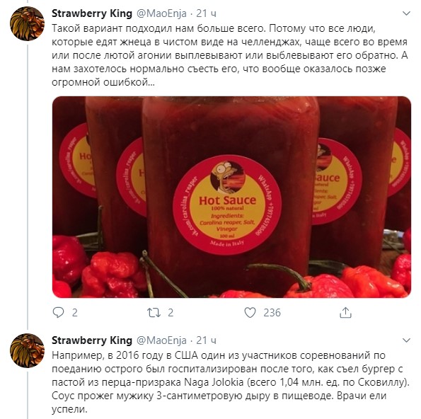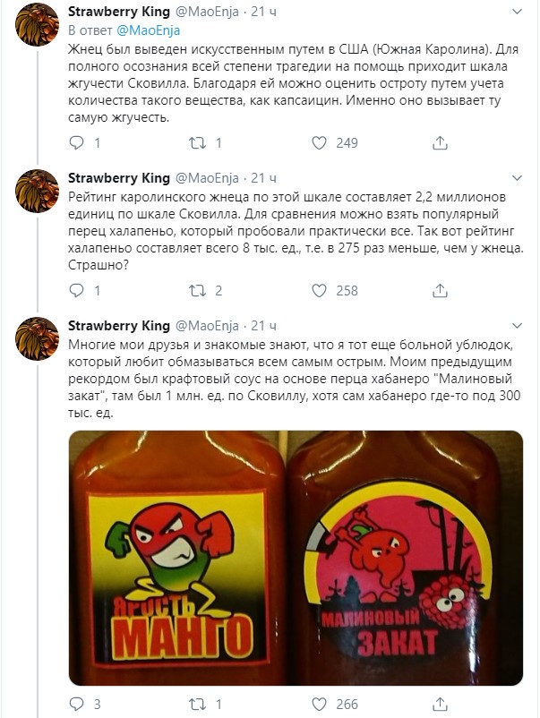 Что бывает с человеком, который решил рискнуть съесть Каролинского жнеца Запостил: Viking,31-01-2020, 00:00вС миру по нитке / Золото Рассказ о том, что случается с человеком, который решил рискнуть съесть Каролинского жнеца (Carolina Reaper), занесенного в книгу рекордов Гиннесса как самый острый перец в мире. И о том, почему на самом деле не стоит этого делать. Что бывает с человеком, решил рискнуть съесть, Каролинского жнеца Нравится 14 Не нравится 1 Комментарии (1) Добавить комментарий Прокомментировать Введите два слова с картинки: Отправить #1 Гость Роман Гость 1 февраля 2020 19:14 +1 Проще сразу серной кислоты выпить и не мучиться. Ответить