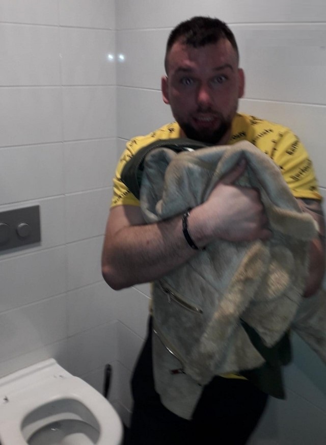 Польская полиция ищет вот этот полудурка, который в ночном клубе городка Чеховице-Дзедзице пробрался в женский туалет, заперся в одной из кабинок, а потом незаметно просовывал руку со смартфоном под перегородку, чтобы снимать, чем там занимаются девушки в соседних кабинках. Так вот, одна из "жертв" извращенца заметила руку, выхватила его смартфон, натянула стринги на тугую попку и уже со своим телефоном ворвалась в его кабинку, сделала два снимка и убежала. Подлец успел скрыться, теперь его ищет полиция. Причем у полиции есть его смартфон, заполненный доказательствами. Чуваку грозит до 5 лет тюрьмы за такие шалости.Классные фотки у пани вышли! Молодцом, kurwa!
