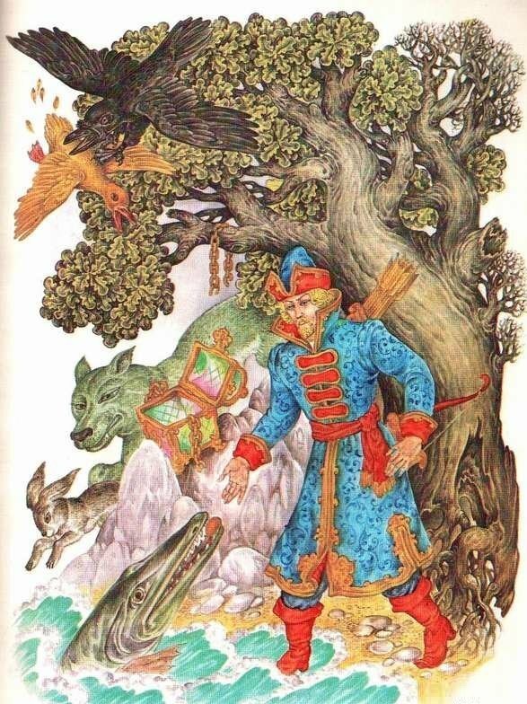 Есть теория, что Кощей в бытность свою простым злобным чародеем отделил свою жизненную силу и сконцентрировал её на острие иглы, тем самым обеспечив себе практически вечную жизнь. А вот иглу он свою прятал в сундуке, набитом живностью именно в старинном дубе. Этакая пасхалочка к «мировому древу» славян. Хранителями иглы были представители всех разделов мира: вода - море-океан, земля - остров, растения - дуб, животные - заяц, птицы - утка. Таким образом, когда герой достигает заветного места, он как бы, оказывается у истоков мироздания.