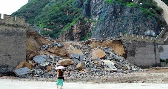 Великая Китайская стена (ВКС), когда дождь ее размыл, оказалась, к всеобщему удивлению, плохо слепленным новоделом... Она представляет собой лишь вал из глины высотой 4 м., обложенный одним-двумя слоями кирпича. Вал вполне могли создать трудармейцы при Мао Цзедуне. Внутри вала люди обнаружили стеклотару, ржавые пустые консервные банки и то, что вывозится на свалки. Незамысловатая кирпичная кладка создана в 90-е года прошлого века при "реставрации" ВКС.