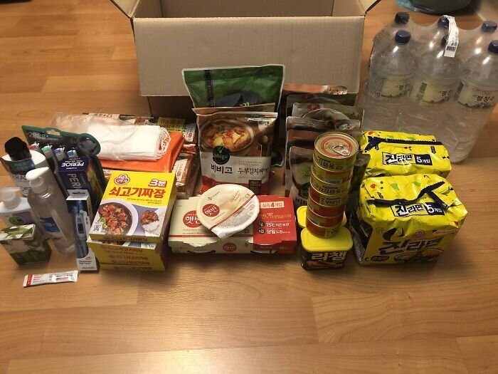 Правительство Южной Кореи помогает тем, кто, приехав за границей, оказался на карантине, преодолеть соблазн выйти из дома! Каждый из оказавшихся в домашнем заточении получает "карантинный набор" - целый ящик продуктов и гигиенических средств, которых точно хватит на две недели за закрытыми дверями!