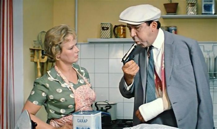 В кадре, когда жена Семён Семёныча после вечеринки в ресторане «Плакучая Ива» роняет пистолет на пол, на рукояти видны латинские буквы «PB» – то есть «Пьетро Беретта».