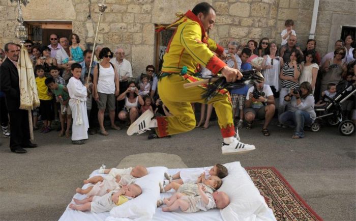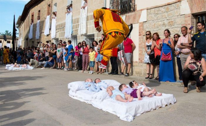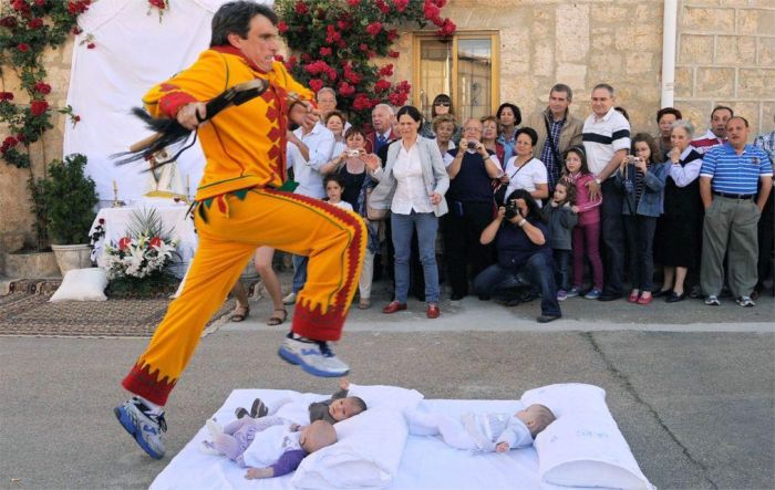 Это странное действо, ведущее свое происхождение от древнего ритуала, проходит ежегодно в городе Кастильо де Мурсия. На праздник туда съезжаются толпы туристов и СМИ, при том, что город населяют 275 человек.Прямо на старинной мостовой горожане устанавливают импровизированные кроватки, на которые выкладывают детей, не достигших 12-месячного возраста. Далее, на «сцене» появляются главные участники мистерии – мужчины из братства Сантисимо-Сакраменто де Минерва в ярких желто-красных костюмах и масках «дьяволов». Один за другим ряженные с разбегу перепрыгивают через ряды беззащитных младенцев, с резвостью заправских атлетов. Эта традиция берет начало в XVII веке.
