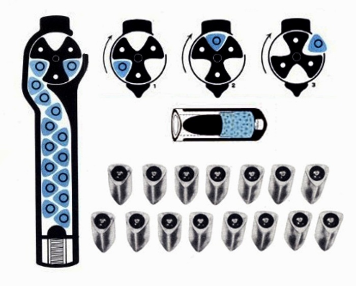 Все дело в том, что такие патроны являются способом наиболее эффективно использовать пространство в магазине, ведь между ними не остается пространства, как это бывает у стандартных цилиндрических аналогах. Именно поэтому небольшой по размеру магазин пистолетного револьвера Dardick Model 1500 вмещает за раз полтора десятка патронов.