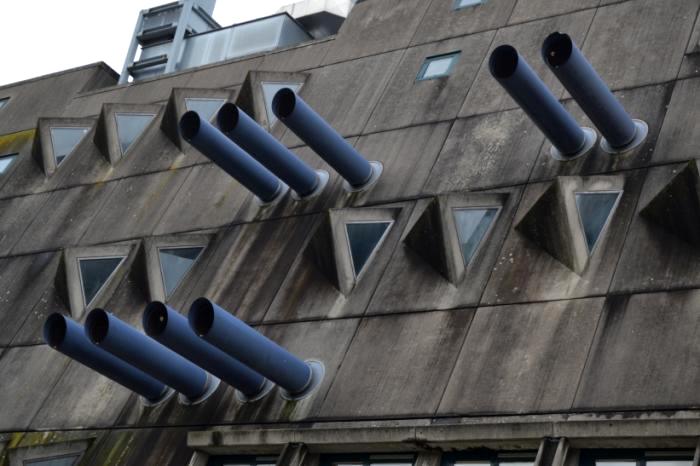 Так, например, длинные синие трубы, которые выглядывают не только на крыше, но и с боков здания и придают ему то самое сходство то ли с военным кораблем, то ли с космическим челноком имени Джорджа Лукаса, на самом деле обеспечивают необходимый уровень вентиляции помещений. Треугольная форма окон также была использована не просто так. Они были специально разработаны такими, чтобы предотвращать попадание в лаборатории прямых солнечных лучей.