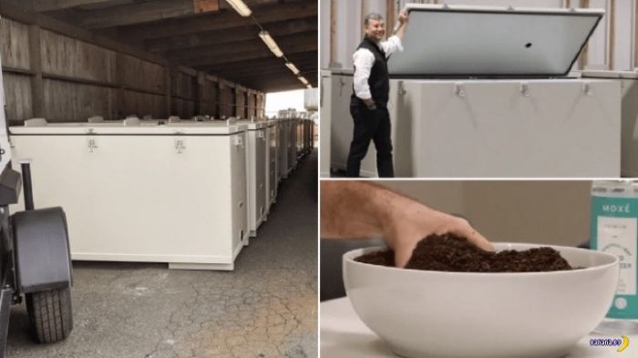Поэтому тела умерших людей помещают в специальные герметичные боксы, которые заполнены скошенной люцерной, пеплом и деревянными опилками. Для ускорения разложения внутри боксов подаются вода, тепло и воздух. Примерно через 30 дней от мертвецов остаются только кости и зубы, остальная "органика" уходит в наполнитель.