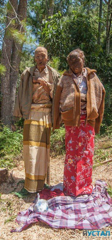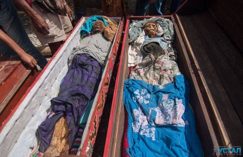 У группы народов Тораджи, проживающий на острове Сулавеси, Индонезия, есть довольно мрачная традиция: ежегодно в августе жители деревни откапывают своих мертвых родственников, моют их, переодевают и "отводят" к месту их смерти, а потом в деревню, после чего укладывают обратно в обновленные гробы.