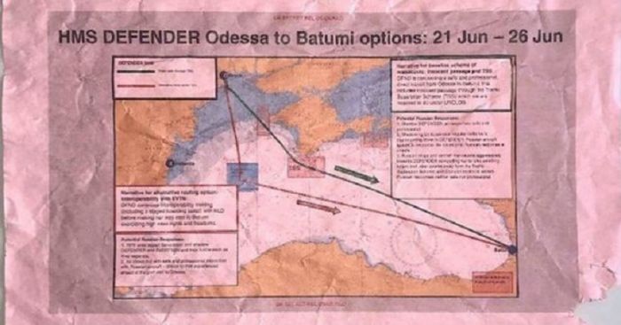 В штабе рассматривали два возможных маршрута "Дефендера" и три вероятных варианта ответных действий России - от "безопасных и профессиональных" до "небезопасных и непрофессиональных". Выбор остановили на курсе, описанном как "безопасный и профессиональный прямой маршрут из Одессы в Батуми". В документах говорилось, что такой вариант позволил бы продемонстрировать, что Британия считает воды вблизи Крыма украинскими.
