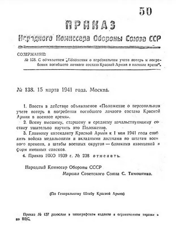 15 марта 1941 года Нарком обороны СССР Семен Тимошенко подписал приказ «О порядке погребения погибших военнослужащих офицерского, сержантского и рядового состава». В нем подробно описывался порядок захоронения советских солдат и офицеров. Так, к примеру, в директиве значилось, что выносить погибших с поля боя для дальнейшего придания земле обязательно вне зависимости от сложившейся обстановки. Иными словами, даже если противник ведет активный огонь, солдаты обязаны убрать тело своего сослуживца с места обстрела и передать его специальной команде погребения.