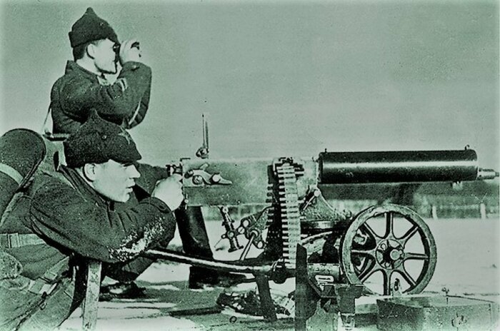Пришла традиция «пеленания» пулеметными лентами с флота. Первыми так стали делать морские пехотинцы, которые в то время отбирались из простых матросов и использовались для десантных операций. Тягать за собой патронные коробки при десантировании было очень неудобно. Впрочем, делали так не только в России. Австрийские, немецкие и французские солдаты также нередко заматывались в пулеметные ленты в годы Первой мировой войны.