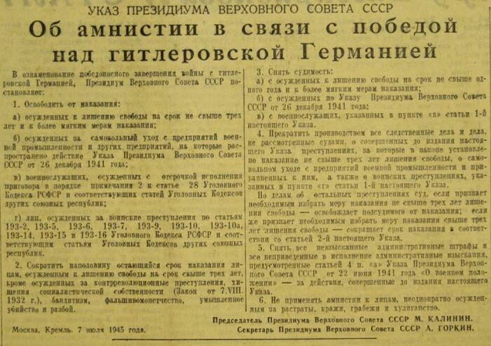 Совершенно очевидно, что не все штрафники успели «искупить кровью» свои прегрешения на момент окончания войны. Что же с ними стало, ведь боевые действия в Европе закончились? На самом деле все предельно просто. Дело в том, что 7 июля 1945 года Президиум верховного совета СССР выпустил указ «Об амнистии в связи с победой над гитлеровской Германией». А 18 июля 1945 года вышел поясняющий приказ Наркомата обороны СССР, который подтвердил, что амнистия, объявленная верховным советом, всецело распространяется и на оставшихся бойцов штрафных подразделений.