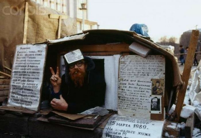 Оказывается, палаточный городок с чумазыми бродягами, сумасшедшими и маргиналами всех мастей в самом центре столицы - это отнюдь не украинское изобретение. Один из первых палаточных городков борцов за политические и гражданские права появился в июле 1990 года в Москве. В наше время и представить трудно, что на протяжении шести месяцев в самом сердце столицы жили в палатках десятки "ходоков к власти" - так этих людей называли в прессе.
