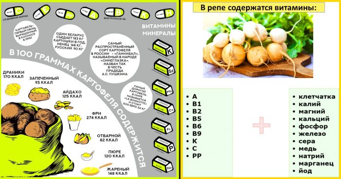 В России картофель появился в конце 17-го века. С этого времени он стал медленно, но уверенно вытеснять из рациона привычную репу. Это произошло по ряду причин. Прежде всего, правительство способствовало распространению картофеля, несмотря на активные протесты крестьян. Окончательно овощ стал привычным для населения к началу 20-го века. Маловероятно, что в то время люди сравнивали полезные свойства продуктов. Тем не менее, картофель богат на различные микроэлементы, аминокислоты, витамин С, пектины, витамины B1 и B2, клетчатку. Репа не уступает по уровню пользы, так как содержит много кальция, витаминов C, B1, B2, B5, фосфора и других элементов.