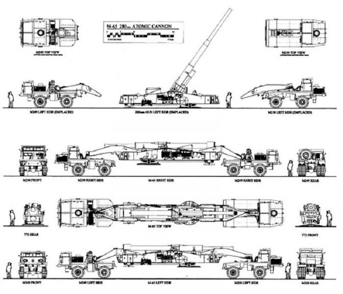 Итогом их разработок стало орудие под индексом T131, который позднее сменился на M65. Но в истории оно известно под прозвищем Atomic Annie. Это забавное имя досталось пушке также по наследству: когда в начале 1944 года американцы высадились на итальянское побережье, немцы применили против них те самые пару уже упомянутых K5 – и эти грозные и принесшие союзникам немало горя пушки получили в рядах американски К5, которые сами солдаты армии США прозвали Anzio Annie. От неё женское имя перекочевало и на американское орудие А вот боеприпас к нему пришлось создавать фактически с нуля, пусть и с использованием пушечной схемы. Результатом этой работы стал атомный снаряд W9 T-124 с тротиловым эквивалентом 15 килотонн, который закончили только к 1950 году.