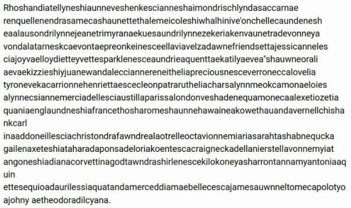 Жительница Техаса Сандра Уильямс впервые стала матерью 12 сентября 1984 года. Она родила девочку, которой решила дать самое лучшее, самое уникальное имя. Женщина долго думала и в итоге составила его из 1019 букв. Имя ребенка заняло в свидетельстве о рождении целых 61 см. Оно вызывает настоящую панику у клерков, когда нужно что-то оформлять или где-то его указывать.