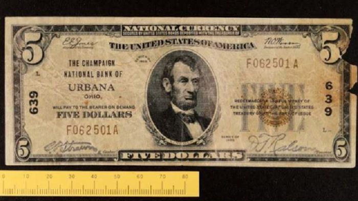 Предположительно, фальшивая 5-долларовая банкнота, сделанная Люстигом.