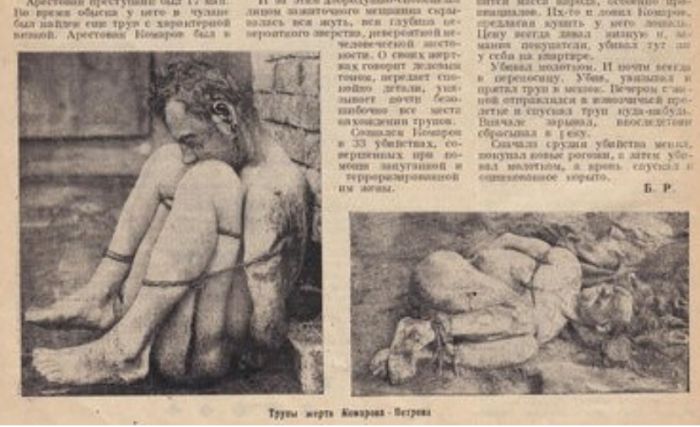 Однажды невольным свидетелем расправы стала супруга Комарова Софья. Женщина во внеурочное время вернулась домой и застала там труп. Она молча взяла тряпку и начала оттирать брызги крови с пола. Так у серийного убийцы появился надежный помощник. Нужно сказать, что женщина справлялась с уничтожением улик идеально. Позже следователи попытались найти следы крови в комнате, где погибли три десятка человек, но не смогли.