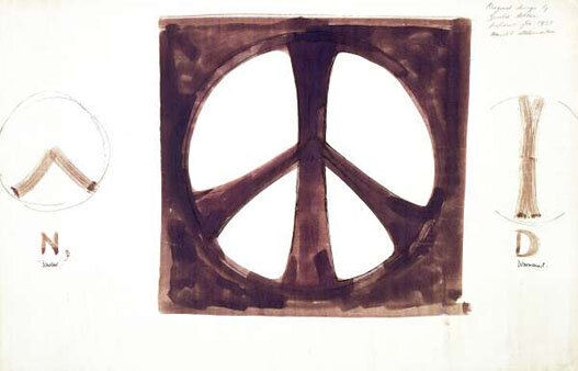 Вот эти две позы сигнальщиков Холтом и объединил в один знак. В Музее мира в Бредфорде (Англия) хранится рисунок Холтома, где видно, как он скомбинировал положение рук сигнальщиков в единый уже привычный всем нам знак. Окружность вокруг знака обозначала земной шар и намекала на всемирный характер движения за мир.