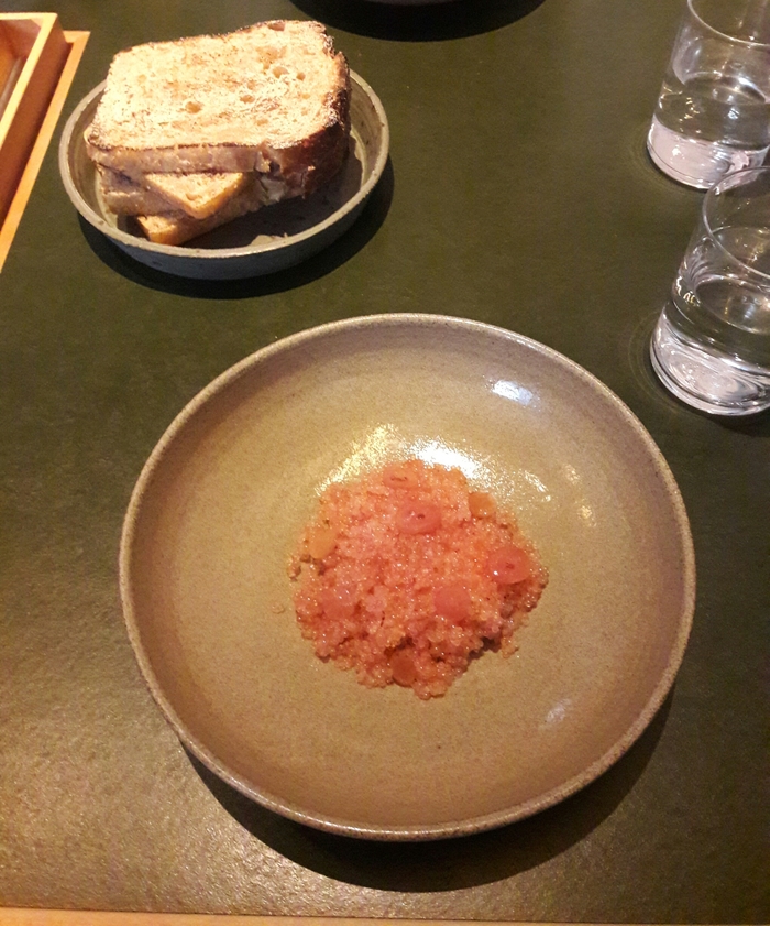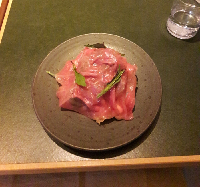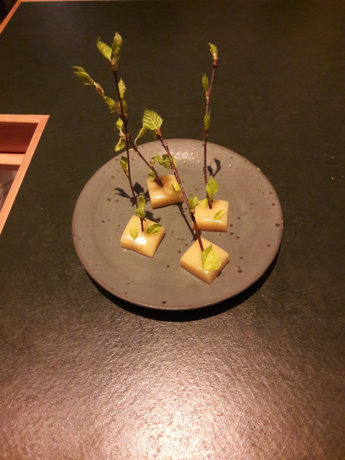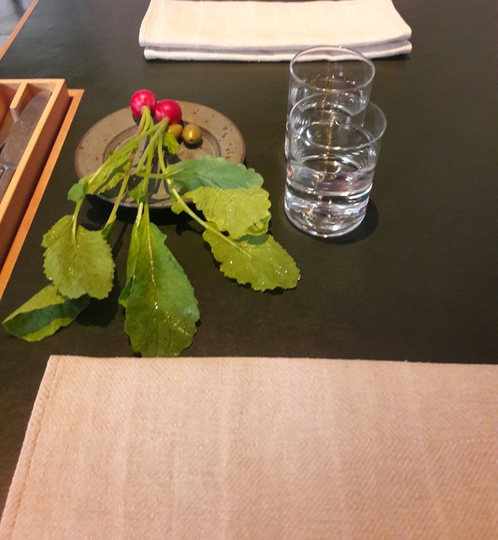 Так вот…Столик довольно маленького размера, почти квадратный, на краю столика есть встроенная емкость для столовых приборов, которых там было как минимум по 12 наборов (т.е. нож, вилка, ложка).Официант принес меню. Фишка этого ресторана, как кстати я читал и многих мишленовских, в том, что меню разбито на так называемые сеты. То есть ты не можешь выборочно заказывать разные блюда из меню, а тебе предлагается уже готовый, составленный шеф-поваром набор из 3,4,5…и более блюд. Мы выбрали сет из 6 блюд без алкоголя. С алкоголем в 2 раза дороже выходило примерно.