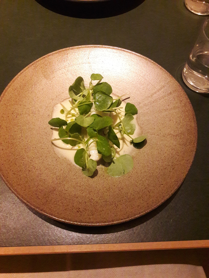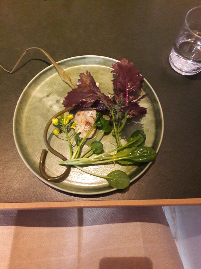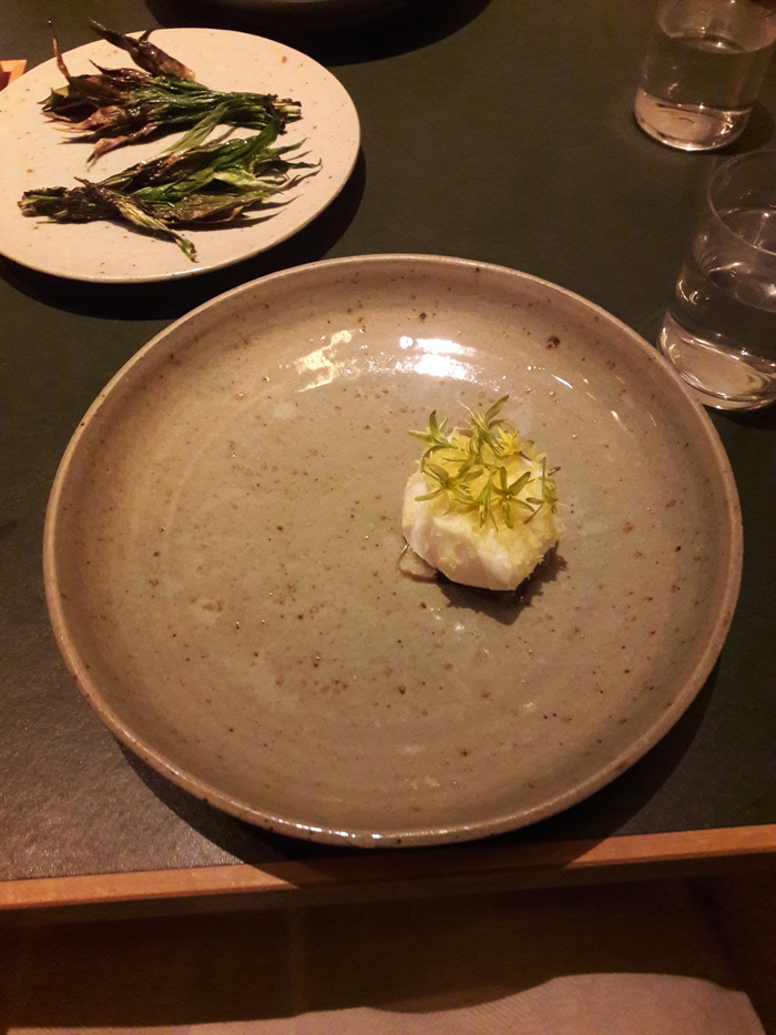 Яйцо в пашоте. Сказали, что гусиное. Никогда не ел. Вкусно кстати, но маловато. Трава была зажарена на огне, что за трава, забыл, да и не помнил особо, съел все, даже цветочки.