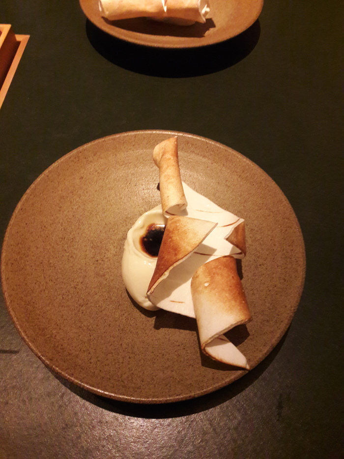 Насколько я помню, это перепелиное яйцо в каком-то соусе зеленом и с горчицей. Яйцо было всмятку, вкусное…соус съел тоже…что-то с водорослями. А, да! К нему еще были какие-то тоненькие лепешки на огне. По одной. Похрустели. Пофоткали.