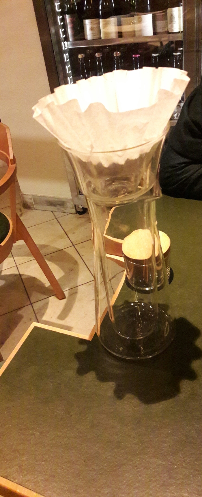 Принесли колбу с фильтром, официант засыпал молотый кофе, который с его слов лично в ресторан доставляют какие-то друзья заведения из Бразилии (не знаю, верить тут или нет), и профильтровал кофе.