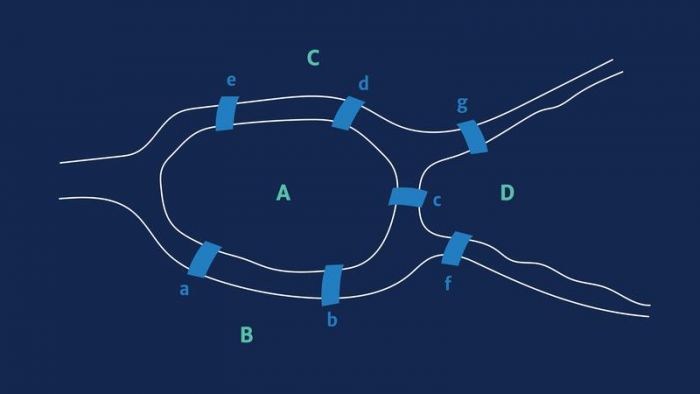 Кенигсберг был построен на берегу реки Прегель (Преголя), которая разделила город на четыре отдельных жилых массива. Люди перебирались из одного района в другой через семь различных мостов. Согласно легенде, популярным развлечением во время воскресных прогулок были попытки пройти через весь город так, чтобы пересечь каждый мост только один раз. Никто так и не придумал, как это сделать, но это вовсе не значит, что задача не имеет решения.