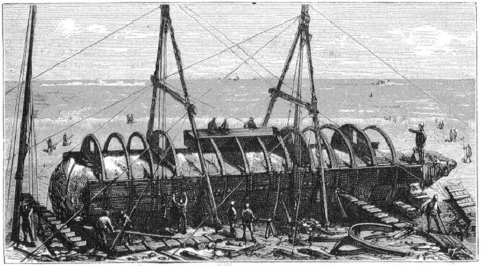 А вот двигателей у «Клеопатры» не было. По сути, она представляла собой плавучий понтон. Причём весь «обвес» к понтону прикрепили уже в порту, куда «Клеопатру» дотранспортировали в форме цилиндра-корпуса по суше. 21 сентября 1877 года её взял на буксир пароход «Ольга» — и отправился в долгое плавание.