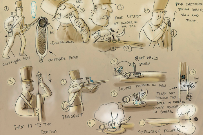 Заряжая со стороны дула нужно было достать порох, отмерить его, отсыпать часть на полку, а часть в дуло, туда же поместить уплотняющий пыж и пулю. Потом шомполом загнать их поглубже. Перевернуть ружьё, прицелиться, выстрелить. И это всё нужно было сделать под выстрелами противника. И заново.