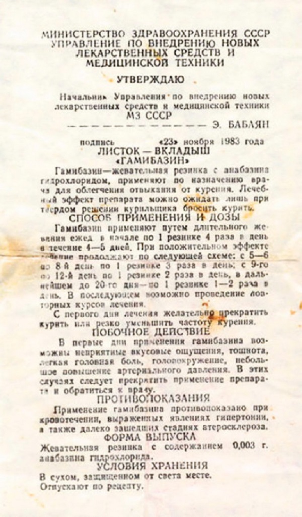 Но был и другой способ избавления от вредной привычки: производственное объединение "Армянский табак" в 80-е годы наладило выпуск специальной жевательной резинки "Гамибазин", облегчающей отказ от курения. Правда, принимать эту жвачку стоило лишь по рекомендации специалиста, и побочные действия были не из приятных, но находились и те, кому это средство помогало довольно эффективно.
