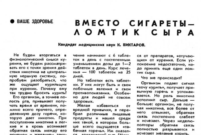 Были и более экзотические методы, причем, одному из них в 1982 году журнал "Наука и Жизнь" отвел целую страницу. Кандидат медицинских наук делился своим открытием: если организму время от времени требуется ощущение горечи, которое дает никотин, нужно найти альтернативный заменитель.