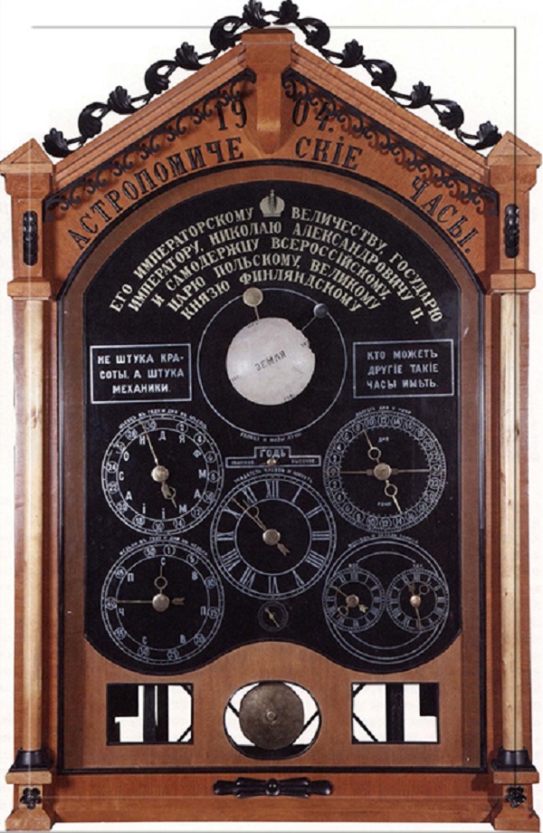 Только после этого удалось выяснить, что это чудо механики было создано в единственном экземпляре крестьянином-самоучкой и преподнесено в качестве дара самому императору. Была найдена даже соответствующая публикация об этом в подборке журнала «Нива» за 1907 год. Современные мастера удивляются, как автору удалось втиснуть в этот механизм столько всего. Тут чего только нет: стрелки — часовая, минутная, секундная, время восхода и захода Солнца, фаз Луны, месяца и числа. Интересно, что часы сами учитывают количество дней в месяце, совершенно автоматически сменяются високосные и простые годы. Дату не нужно переставлять вручную.