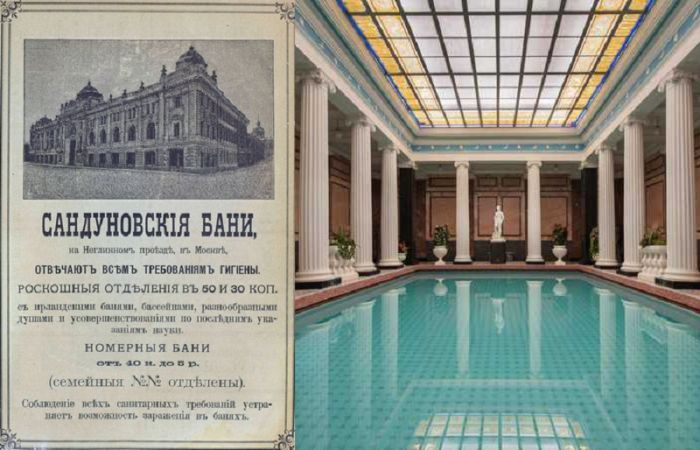 Здание Сандунов было каменным, чтобы предотвратить пожар, а внутри бани разделили на три отделения - «дворянское», «купеческое» и «простонародное», в каждом из которых были мужская и женская территория, а также парилки и «мыльные комнаты». Потолки и стены были отделаны яшмой малахитом и мрамором, повсюду стояли диваны и зеркала, а потолки украшали люстры из хрусталя.